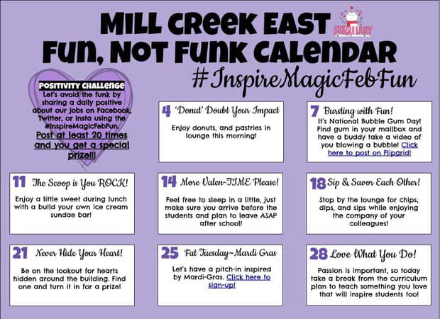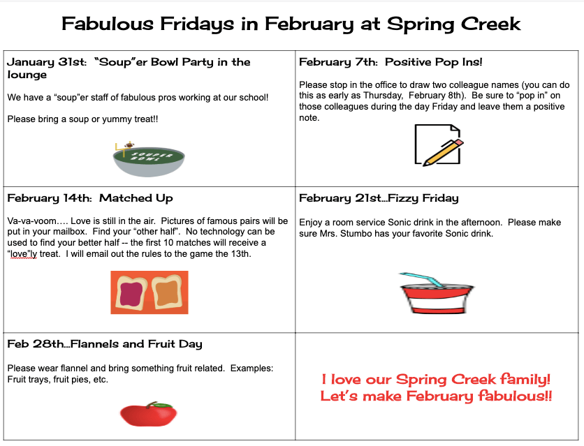 It’s February; the beginning of what can be a tough month for keeping staff energy and morale high. At this point in the year, we are entering our 7th month of school and we are tired! We still have quite a few weeks to go before Spring Break, so how about planning “Fab Fridays in February?” Planning something fun every Friday in February would be a perfect way to look forward to the end of each week this month.